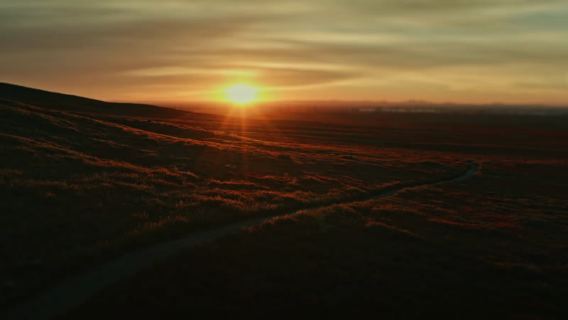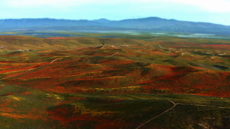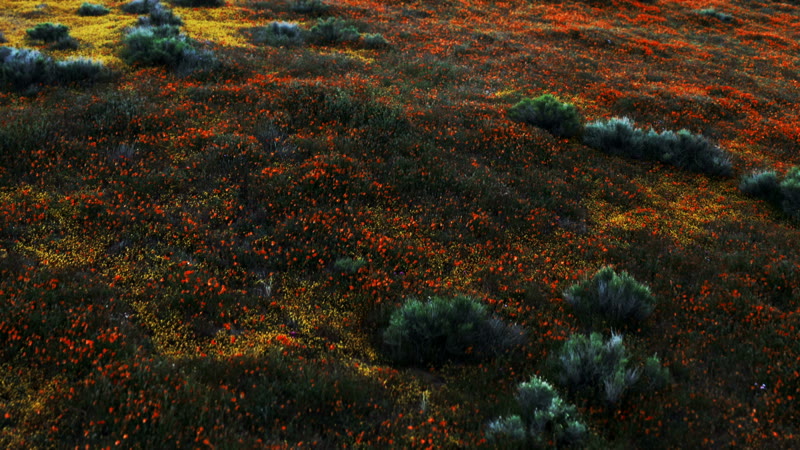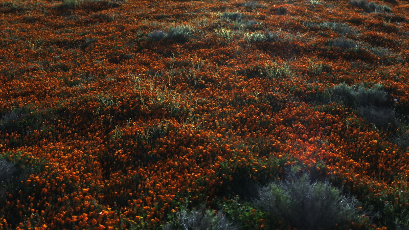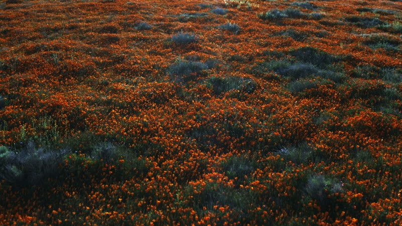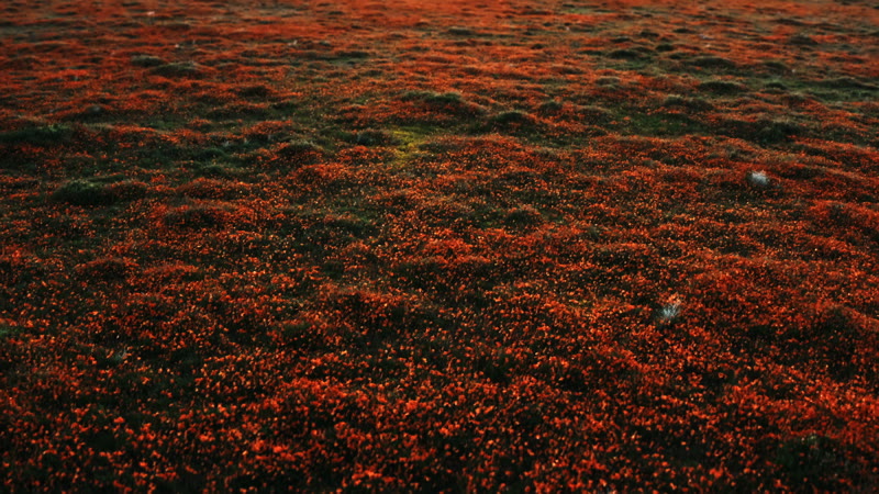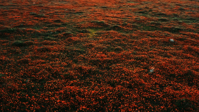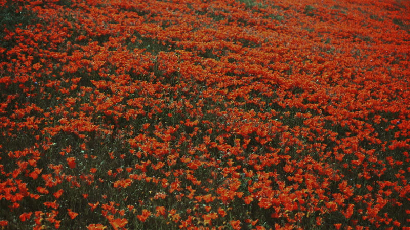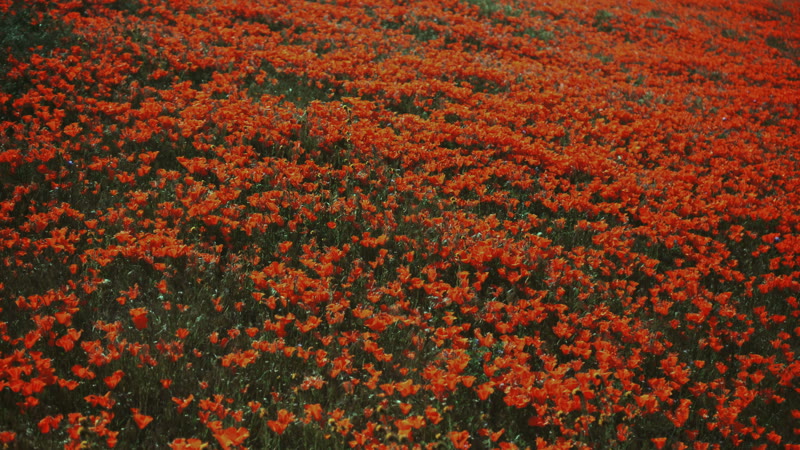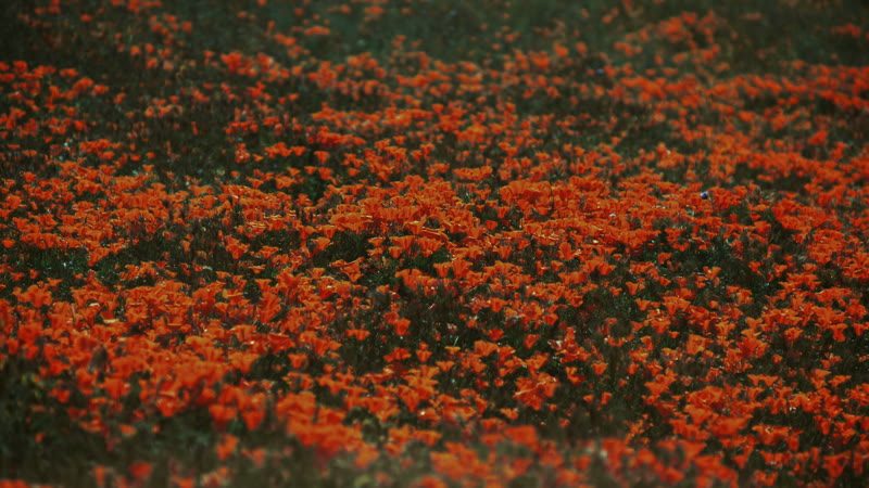 Fly over a field of poppy flowers as they begin to open at sunrise.